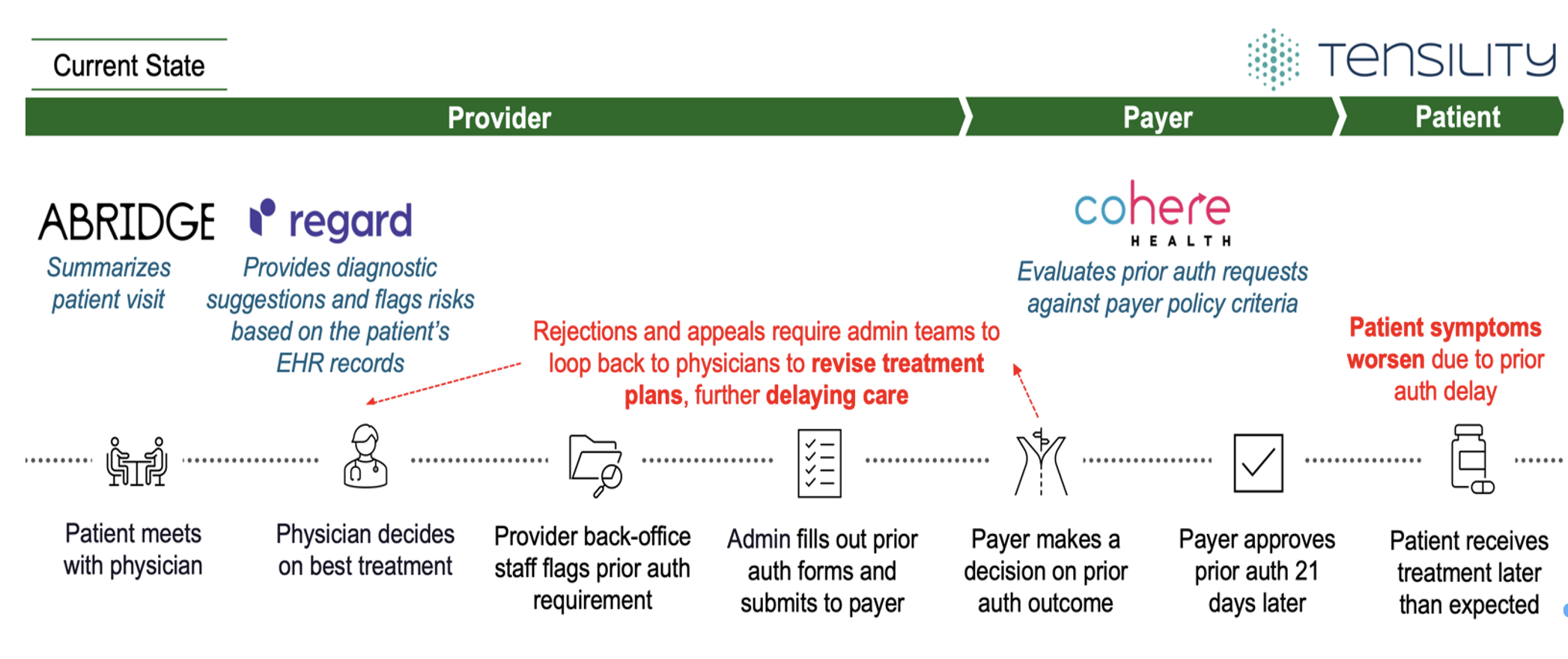Even with real gains from automation, prior authorization remains a problem. While current solutions help the clinician’s workload, they do not automate the critical prior authorization process because they focus on the steps either before or after prior authorization is initiated, not in real time during the clinical decision itself. Figure 1 emphasizes this gap: clinicians still face denials they could not see coming, patients still wait longer than they should, admin teams still spend their days chasing paperwork, and treatment plans are still getting revised after the fact. Tools like Cohere Health, as effective as they are, operate downstream from the clinical encounter, supporting back-office and utilization management teams rather than the clinician making treatment decisions. That makes them well suited for processing prior auth requests efficiently, but they have no ability to inform the decision at the moment care is being planned. The clinical encounter and the payer's decision remain two separate processes, with patients and clinicians left to deal with the gap between them.