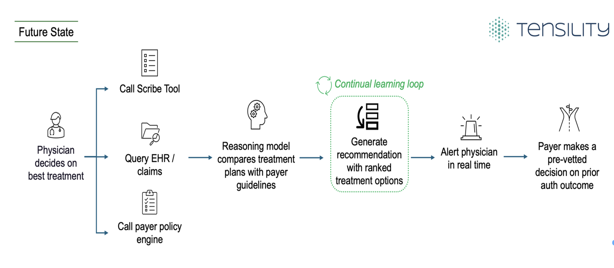 With all three inputs, a reasoning model with learning capabilities compares potential treatment plans against payer guidelines and historical approval patterns, then generates ranked treatment options with predicted approval scores. The clinician sees these recommendations pushed directly into the EHR interface in real time. Every decision, every approval, and every denial feeds back into the model, creating a continual learning loop that makes the recommendations sharper and more accurate over time. The more the system is used, the better it gets at predicting what will get approved and ultimately improve timely patient care.